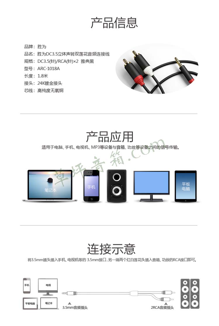 胜为 ARC-1018A 一分二音频线 黑色 3.5转双莲花 电脑音箱 功放线