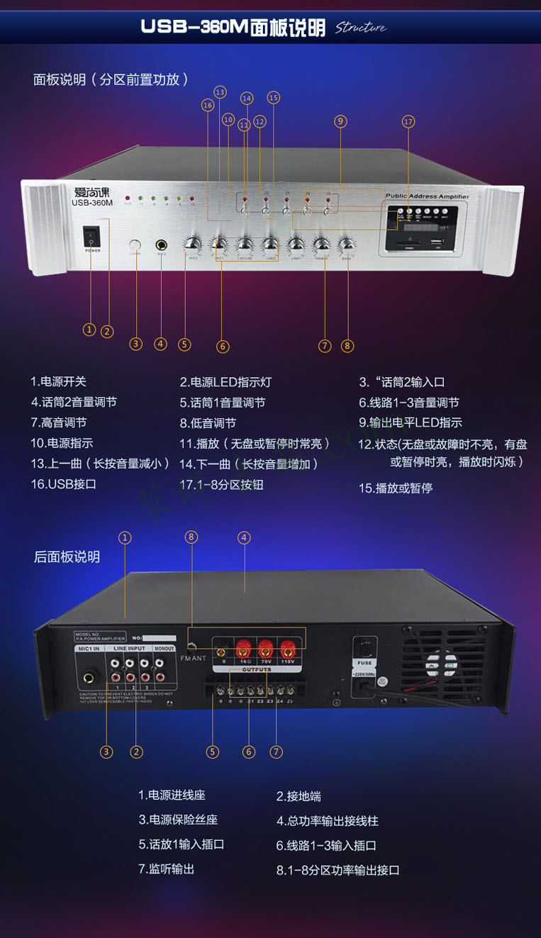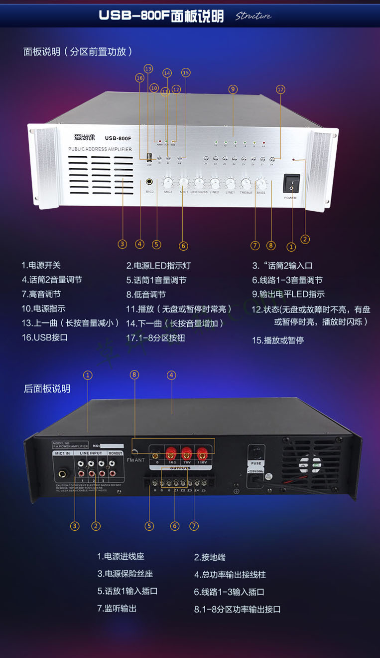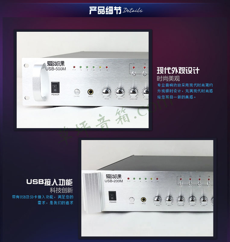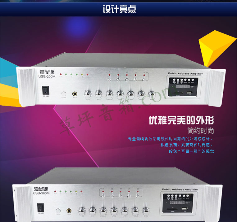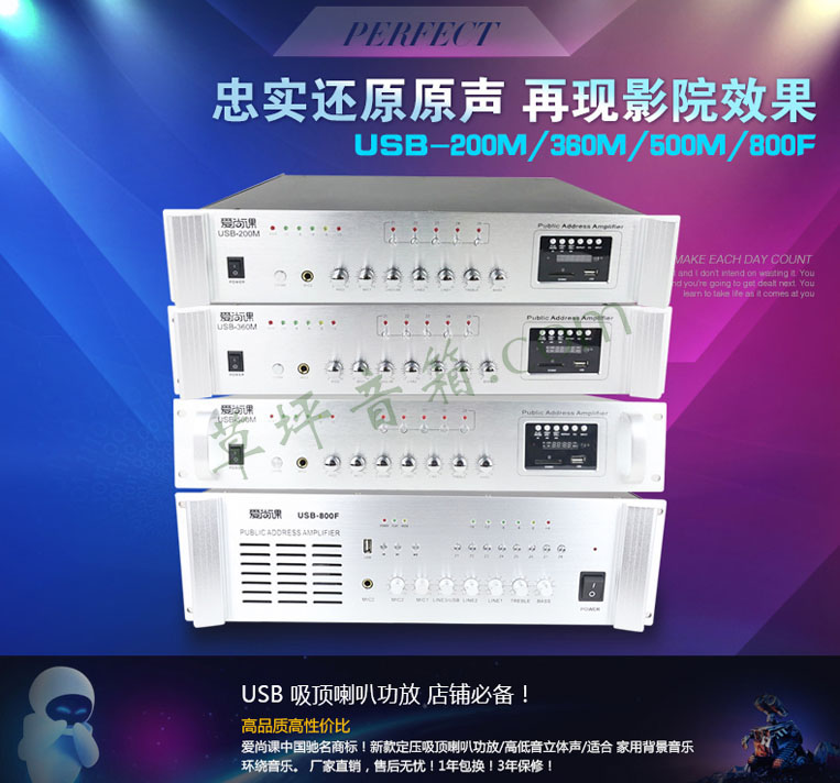 爱尚课 USB-200M/200W定压功放500W工程功放800W吸顶喇叭USB SD