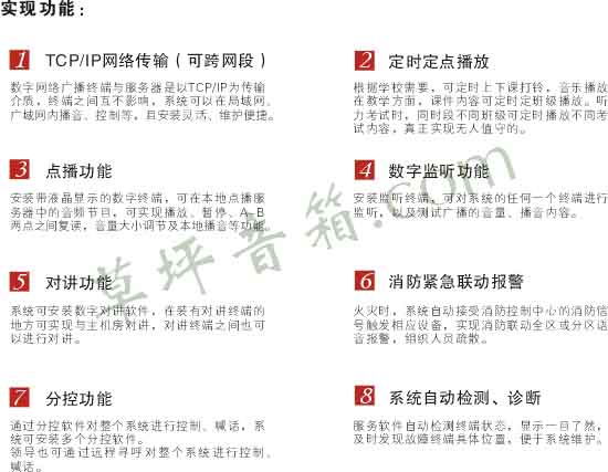 功能方面:可独立控制每个终端播放不同的声音。不仅能够完全实现传统广播系统的基本功能,如定时打铃、分区播放、喊操、消防报警等基本要求,而且还具备音频自由点播、教师安排节目播放等功能;