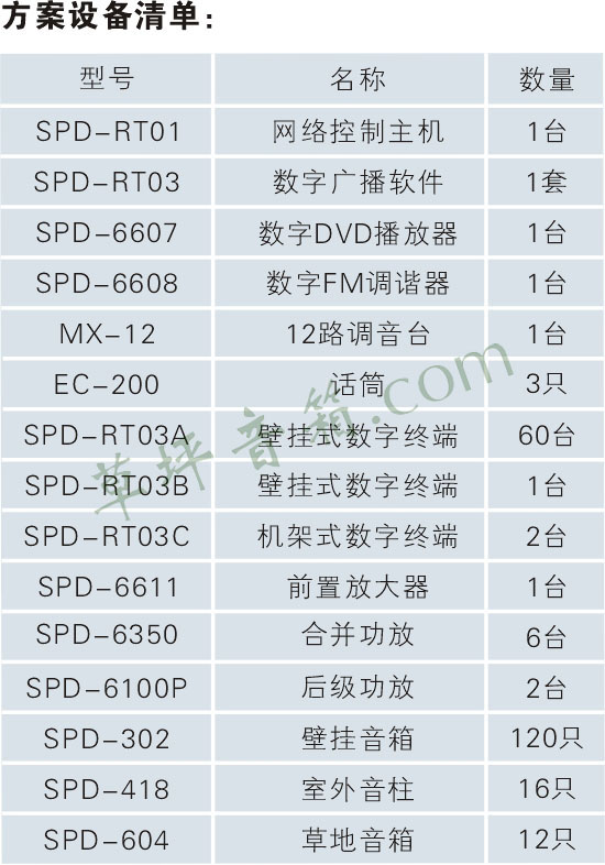 每个班安装2个SPD-311(10W定阻)音箱,一个音频终端;学生宿舍楼安装16个SPD-218(20W)室外音箱,用网络解码终端接入信号,加一台650W功放来推动;食堂区需24个SPD-313(30W)室内音箱,一个网络终端和一台360W纯后级功放;室外操场需6个SPD-490(80W)室外音柱,一个网络终端和一台360W纯后级功放。室内体育馆需4个SPD-418(40W)室外音柱,一个网络终端和一台360W纯后级功放。室外公共区域需40个草地音箱,一个网络终端和一台1500W纯后级功放。SPD-RT数字广播利用学校局域网,广播系统利用数字网络技术,能接入学校的局域网,系统具有有网络化、智能化,便于扩展, 不需重复布线,节省安装成本;各教室能通过遥控器选择节目和控制音量,并可在网络终端插入麦克风,对教室讲话。