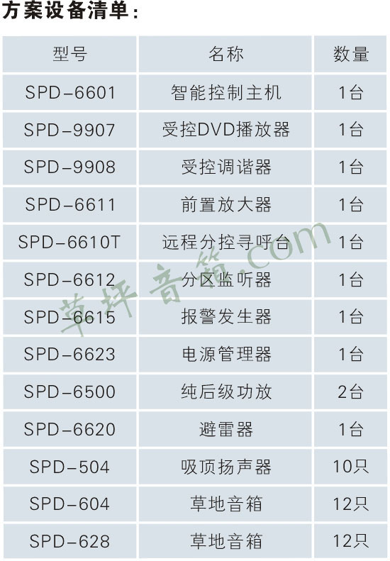 住宅小区背景音乐系统主要用于为小区住户提供日常背景音乐和日常广播通知,还可以进一步实现分区控制广播功能,从而为小区营造高雅优美的生活环境。一般根据小区的实际情况,在中心广场四周和绿化地带设置防雨音柱和草坪音箱,可使小区住户欣赏到高雅悦耳的音乐。根据小区的实际情况,我们选用了SPD-6601智能广播系统,共分为6个分区。室外绿地配置SPD-601草地音箱,停车场配置室外全天候防水音柱SPD-390。