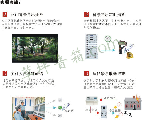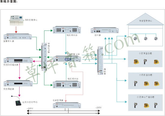 本系统为广播系统典型方案之一,它可以实现分区广播、分区寻呼功能。消防联动报警功能。这些广播功能是比较常见和比较常用的功能,特别适合小区广播系统。